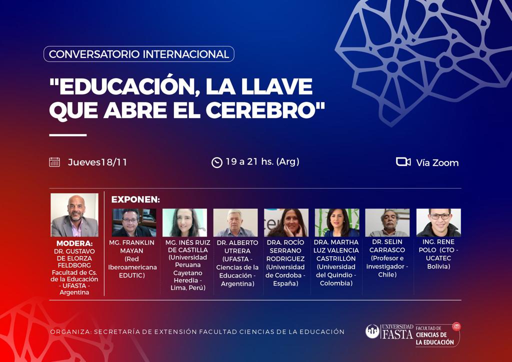 La actividad se realizará de 19 a 21 horas y será de carácter virtual y gratuita. El conversatorio estará moderado por el Dr. Gustavo de Elorza Feldborg, en representación de la Facultad de Ciencias de la Educación de la Universidad Fasta.