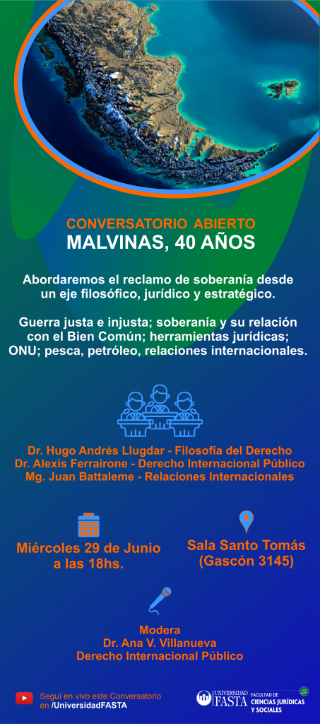 El próximo miércoles 29 se desarrollará el conversatorio abierto “Malvinas, 40 años”. Se trata de un encuentro impulsado desde la Facultad de Ciencias Jurídicas y Sociales, en el cual docentes de dicha Facultad abordarán el tema. La charla será a las 18, en la Sala Santo Tomás, ubicada en la sede de Gascón 3145. También será transmitida en vivo por Youtube.
