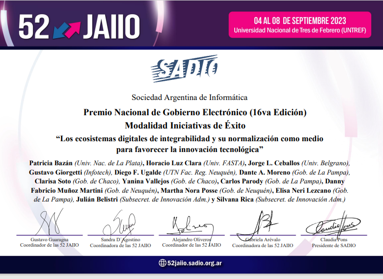 En esta ocasión, el reconocimiento se ha otorgado a la propuesta titulada «Los ecosistemas digitales de integrabilidad y su normalización como medio para favorecer la innovación tecnológica», de Patricia Bazán (Universidad Nacional de la Plata), Horacio Luz Clara (Universidad FASTA), Jorge Luis Ceballos (Universidad de Belgrano), Gustavo Giorgetti (Infotech), Diego Felipe Ugalde (UTN Facultad Regional Neuquén), Dante Adalberto Moreno (Gobierno de La Pampa), Clarisa Soto (Gobierno de Chaco), Yanina Vallejos (Gobierno de Chaco), Carlos Parody (Gobierno de La Pampa), Danny Fabricio Muñoz Martini (Gobierno de Neuquén), Martha Nora Posse (Gobierno de Neuquén), Elisa Neri Lezcano (Gobierno de La Pampa), Julián Belistri (Subsecretaría de Innovación Administrativa) y Silvana Rica (Subsecretaría de Innovación Administrativa).