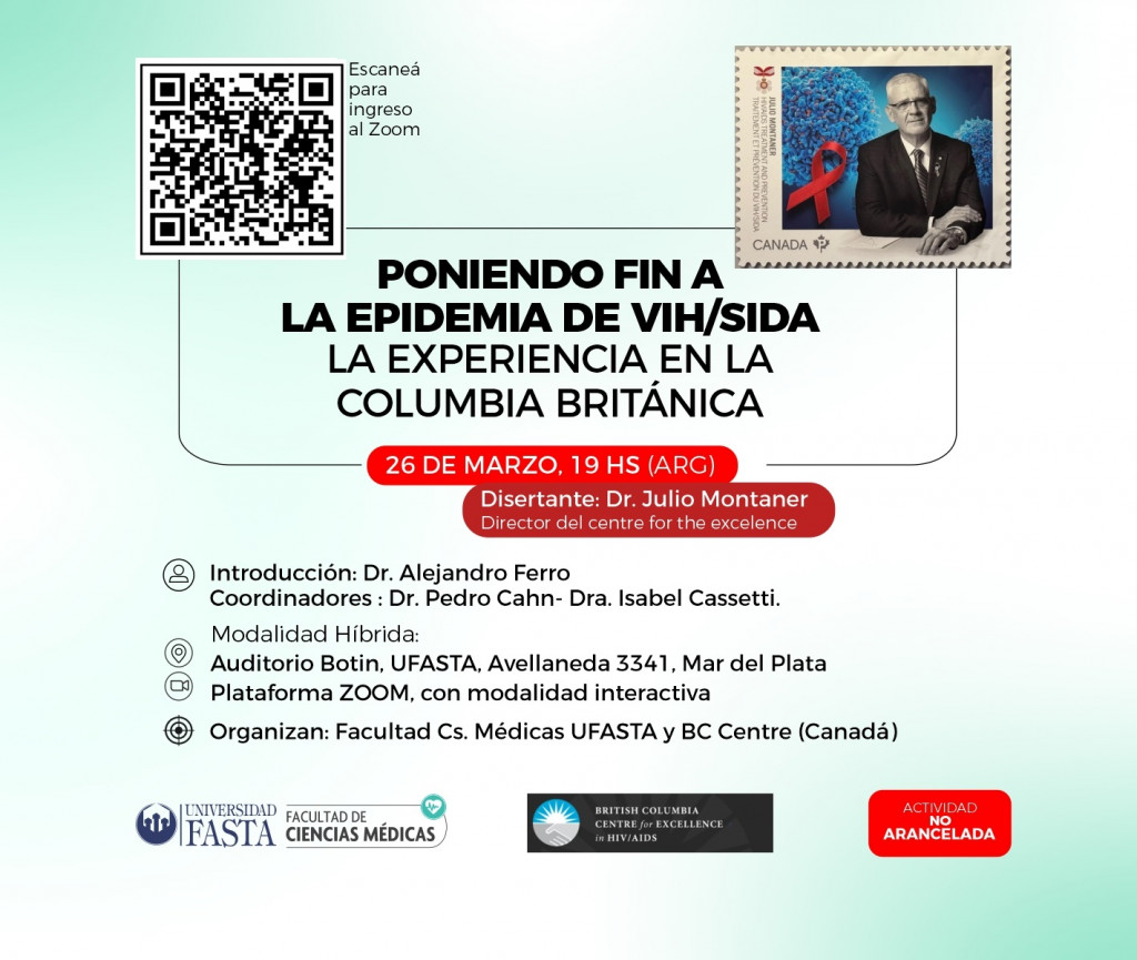 La actividad organizada por la Facultad de Ciencias Médicas UFASTA y BC centre (Canadá), se realizará presencialmente en el Auditorio Botin Facultad de Medicina UFASTA y virtualmente por la plataforma ZOOM, con modalidad interactiva entre el disertante en Vancouver y los coordinadores en CABA y el auditorio Botín.