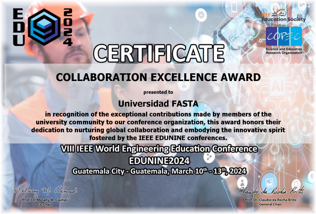 La Universidad FASTA, a través de la Facultad de Ingeniería, ha sido galardonada con el prestigioso Premio a la Excelencia en la Colaboración Académica en el VIII Congreso Mundial de Educación en Ingeniería de IEEE (EDUNINE2024).