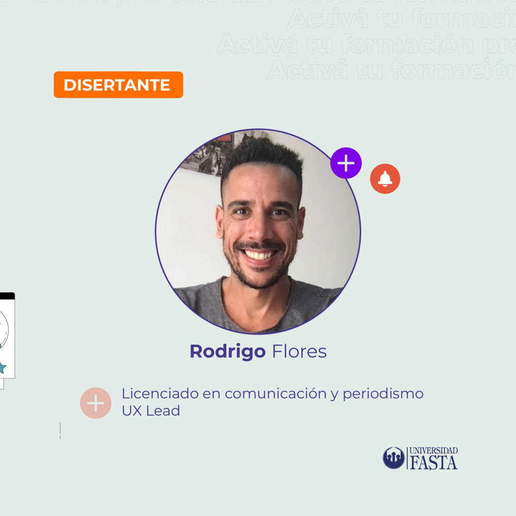 El disertante de este webinar es Rodrigo Flores, Licenciado en Comunicación Social de la Universidad Fasta, cuenta con más de 5 años de experiencia trabajando en el área, actualmente se encuentra liderando un equipo de UX Writers para una entidad financiera, y es docente de cátedra en la materia de Customer Experience dentro de la Licenciatura de Negocios Digitales de la Ufasta.