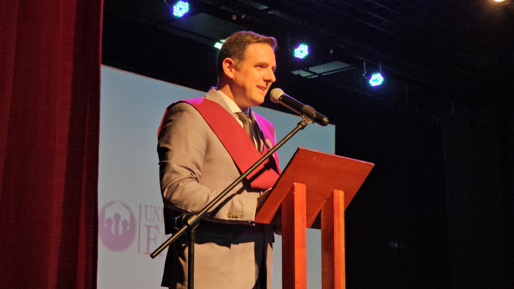 Cabe destacar, algunas de las palabras, que el Vicerrector Académico Asociado, Esp. Lic. Matías Castro Videla mencionó en su discurso «hoy más que un hecho se trata de un acontecimiento, pues los acontecimientos son aquellos hechos que trascienden en la vida de una persona, que marcan su historia para siempre y definen un rumbo, por eso la importancia de este acto en el que los acompaña toda la comunidad Universitaria y sus familias”.